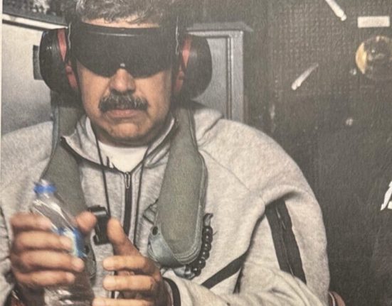 हाथों पर हथकड़ी, आंखों पर काली पट्टी, हाथ में पानी की बोतल, शरीर पर ट्रैक सूट और अमेरिकी सैनिकों से घिरे वेनेजुएला के