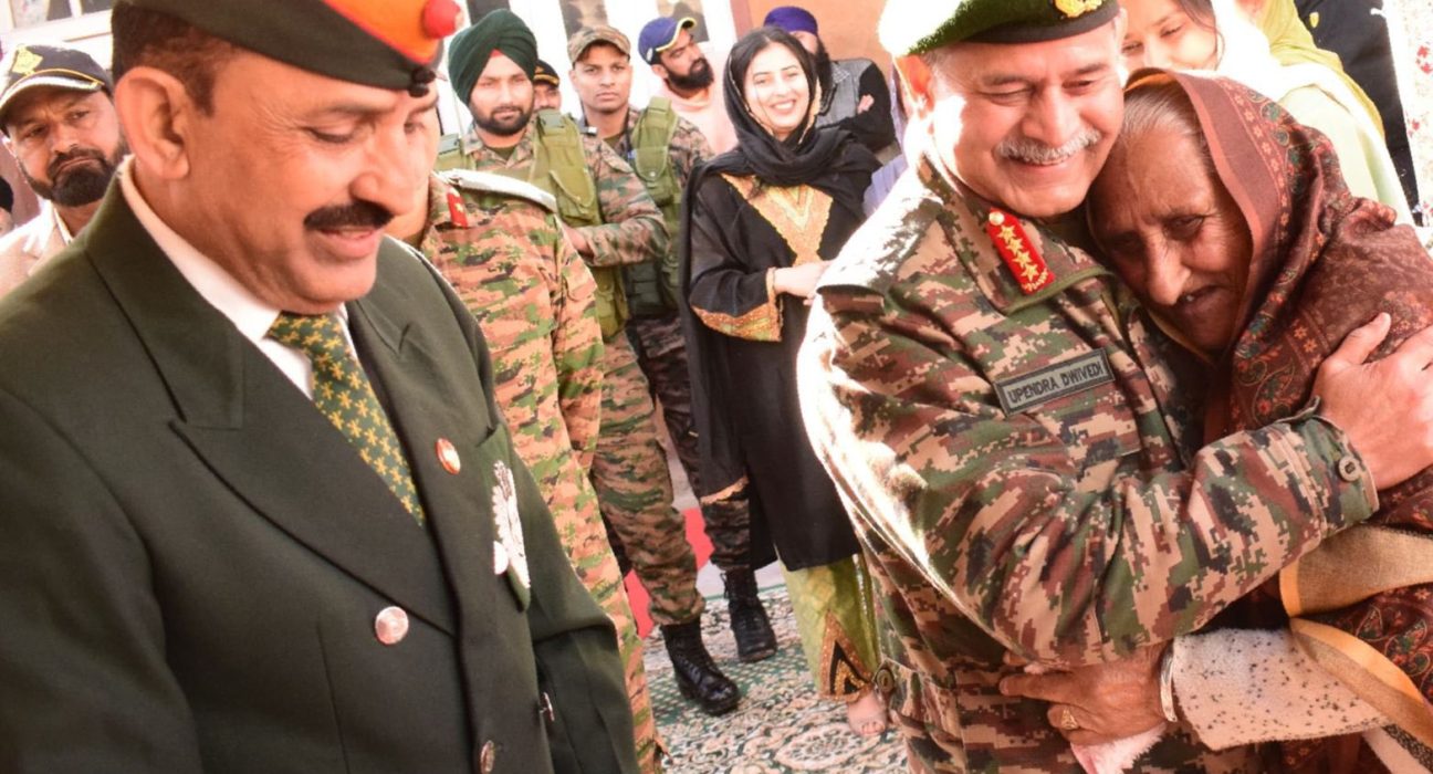 जम्मू कश्मीर के पुंछ जिले में सुरक्षा का जायजा लेने पहुंचे थलसेना प्रमुख जनरल उपेंद्र द्विवेदी ने 20 वर्ष बाद अपनी बटालियन के एक पूर्व सूबेदार साथी से मुलाकात कर आपसी सौहार्द की एक अनोखी मिसाल कायम की.