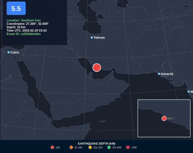 जर्मन रिसर्च सेंटर फॉर जियोसाइंस के मुताबिक गुरुवार को दक्षिण ईरान में भूकंप का झटका महसूस किया गया. जीएफजेड अनुसंधान केंद्र के अनुसार भूकंप का केंद्र सिर्फ 10 किलोमीटर की गहराई में था.